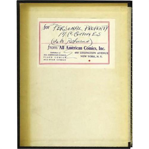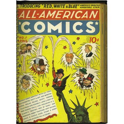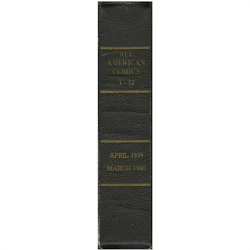 <B>All-American Comics #1-12 Bound Volume (DC, 1939-40).</B></I> A label on the inside front cover reads "Personal Property M. C. Gaines" -- and this volume comes from the company which like the series was called All-American Comics, in fact #1 was the firm's very first publication. Gaines, "the father of the American comic book," ran the company, which maintained close ties to the DC line. The first appearances of such early characters as Scribbly, Hop Harrigan, Red White and Blue, and the Ultra-Man are highlights of these issues (also, amid all the <B>All-American</B></I> issues there's a copy of <B>Mutt and Jeff</B></I> #1). The ring-bound comics in this black hardcover have cream to tan pages with brittle edges. The covers are in superb condition and would please any collector. Overstreet 2007 VG 4.0 value for group = $4,912.<BR><BR><b>Shipping:</b> Books & Catalogs (<a target="_blank" href="http://www.heritageauctions.com/common/shipping.php">view shipping information</a>)