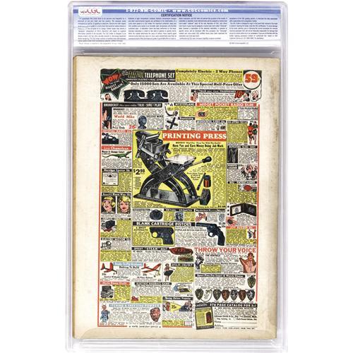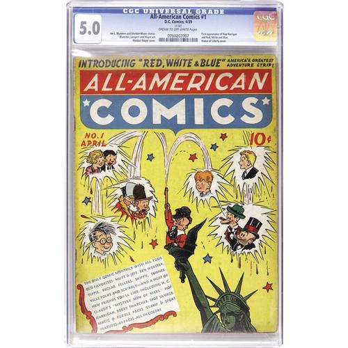 <B>All-American Comics #1 (DC, 1939) CGC VG/FN 5.0 Cream to off-white pages.</B></I> Here's a book that's rarely seen on the market. A unique mix of established characters and new material, this book introduced Hop Harrigan, Scribbly (by Sheldon Mayer), and Red White and Blue, presented alongside such established strip features as <I>Mutt and Jeff</B></I>, <I>Toonerville Folks</B></I>, <I>Reg'lar Fellers</B></I>, <I>Skippy</B></I> and more. CGC notes, "Centerfold detached." Overstreet 2006 VG 4.0 value = $1,400; FN 6.0 value = $2,100. CGC census 7/06: 1 in 5.0, 4 higher. <BR><BR><B>Important notice:</B> Heritage usually auctions material at the rate of 200-250 lots per hour. On some occasions eBay Live bid software or the Internet may not be able to keep up with the pace of the auction. We recommend placing a realistic absentee bid now as insurance to avoid disappointment. Occasionally the auctioneer may eliminate or reject an eBay Live bid, and the auctioneer may also reopen a lot after the close of the eBay live bidding (usually because we missed an audience bid), and may reject your bid even if it shows you as the winning bidder. By bidding via eBay Live, you agree that Heritage may award the lot to another bidder at its sole discretion under the circumstances described above or any other reasonable circumstances. Since eBay bids are not shown to us until we open the lot on the floor, we treat those bids just like floor bids. In most cases the floor responds before the eBay bid is presented to us, due to Internet lag time, so for consistency we have made it a policy that floor bids are always considered first over tie eBay live bids. Also please note that all Heritage lots purchased through eBay Live carry a 22.5% Buyer's Premium. Please make sure you read the Terms and Conditions before you bid. This lot is being auctioned in conjunction with a live floor auction by Heritage Auction Galleries. All final auction and invoice information will be supplied by Heritage Auction Galleries, and all other information should be considered preliminary. Lot:41001 <BR><BR><B>Winning Notification and Billing:</B> After the FINAL session in this auction is complete, Heritage will send e-mail and snail mail invoices. This process normally takes several days. All final auction and invoice information will be supplied by Heritage Auction Galleries, and all other information should be considered preliminary. <BR><BR>This auction will be conducted on a live auction floor and over the Internet through eBay Live. If you choose to place an absentee bid, please take a moment to <font color='#0000ff'><u><a href='http://pages.ebay.com/liveauctions/help/before/laabsentee.html'>learn how eBay Live absentee bidding works</a></u></font><font color='#000000'>