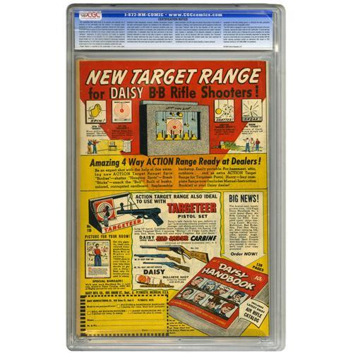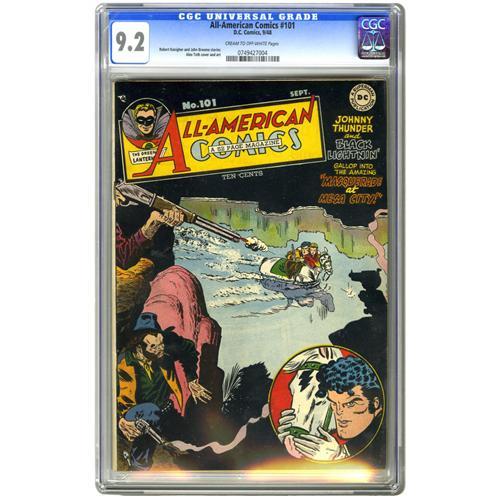 <B>All-American Comics #101 (DC, 1948) CGC NM- 9.2 Cream to off-white pages.</B></I> This issue, the second-to-last of the long-running title, is "scarce" according to Overstreet, and we've got the highest-graded copy yet certified! The grade is quite impressive for a black-cover issue, and speaking of that, the black is used to great effect by Alex Toth, who drew the cover as well as the story featuring Johnny Thunder (this is the Western Johnny Thunder, not the funny guy with the thunderbolt). The mixed bag of features includes superheroes Green Lantern and Dr. Mid-Nite. Meanwhile, Mutt and Jeff, who had hardly missed an issue in the series' entire run, bowed out here. Overstreet 2006 NM- 9.2 value = $1,800. CGC census 3/06: 1 in 9.2, none higher.