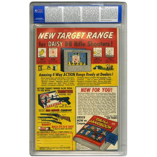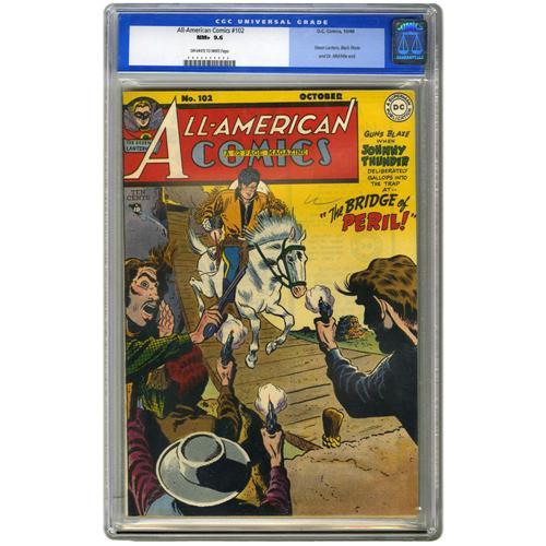 <B>All-American Comics #102 (DC, 1948) CGC NM+ 9.6 Off-white to white pages.</B></I> The last issue of one of DC's most significant Golden Age titles continued the Western theme that had prevailed since #100. With the next issue, the title would become <B>All-American Western</B></I>, ending the runs of non-Western headliners Green Lantern, Black Pirate, and Dr. Mid-Nite. Alex Toth provided cover and story art for this issue, listed as "scarce" by Overstreet and "uncommon" by Gerber. Such adjectives certainly describe this copy, the only one of the issue to be certified higher than 9.2 by CGC to date. Overstreet 2006 NM- 9.2 value = $3,800. CGC census 3/06: 1 in 9.6, none higher.