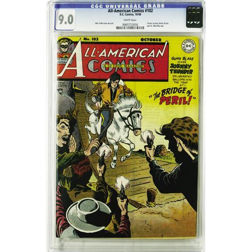 <B>All-American Comics #102 (DC, 1948) CGC VF/NM 9.0 White pages.</B></I> Green Lantern, Dr. Mid-Nite, and the Black Pirate all end their respective runs in the pages of this scarce transitional issue. Cover star Johnny Thunder shifts the direction from superhero to Western, a change made complete with the following issue, which was retitled <B>All-American Western</B></I>. Art for this issue includes work by Alex Toth, Martin Naydel, and Irwin Hasen. Overstreet 2006 VF/NM 9.0 value = $2,778; NM- 9.2 value = $3,800. CGC census 5/06: 1 in 9.0, 3 higher. <BR><BR><B>Important notice:</B> Heritage usually auctions material at the rate of 200-250 lots per hour. On some occasions eBay Live bid software or the Internet may not be able to keep up with the pace of the auction. We recommend placing a realistic absentee bid now as insurance to avoid disappointment. Occasionally the auctioneer may eliminate or reject an eBay Live bid, and the auctioneer may also reopen a lot after the close of the eBay live bidding (usually because we missed an audience bid), and may reject your bid even if it shows you as the winning bidder. By bidding via eBay Live, you agree that Heritage may award the lot to another bidder at its sole discretion under the circumstances described above or any other reasonable circumstances. Since eBay bids are not shown to us until we open the lot on the floor, we treat those bids just like floor bids. In most cases the floor responds before the eBay bid is presented to us, due to Internet lag time, so for consistency we have made it a policy that floor bids are always considered first over tie eBay live bids. Also please note that all Heritage lots purchased through eBay Live carry a 22.5% Buyer's Premium. Please make sure you read the Terms and Conditions before you bid. This lot is being auctioned in conjunction with a live floor auction by Heritage Auction Galleries. All final auction and invoice information will be supplied by Heritage Auction Galleries, and all other information should be considered preliminary. Lot:41001 <BR><BR><B>Winning Notification and Billing:</B> After the FINAL session in this auction is complete, Heritage will send e-mail and snail mail invoices. This process normally takes several days. All final auction and invoice information will be supplied by Heritage Auction Galleries, and all other information should be considered preliminary. <BR><BR>This auction will be conducted on a live auction floor and over the Internet through eBay Live. If you choose to place an absentee bid, please take a moment to <font color='#0000ff'><u><a href='http://pages.ebay.com/liveauctions/help/before/laabsentee.html'>learn how eBay Live absentee bidding works</a></u></font><font color='#000000'>