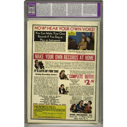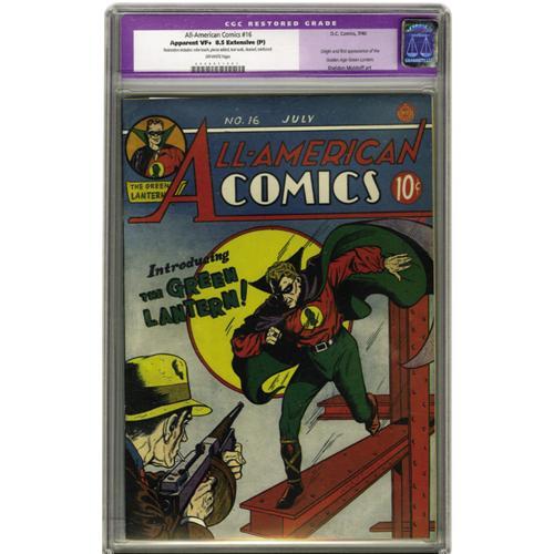 <B>All-American Comics #16 (DC, 1940) CGC Apparent VF+ 8.5 Extensive (P) Off-white pages.</B></I> The story with Green Lantern's origin and first appearance is what makes this one of the five most valuable comic book issues. The main reason it's valued higher than the debuts of other top DC heroes (Wonder Woman, the Flash, etc.) is because of the scarcity of the book: Overstreet calls it "rare," while Gerber gives it a 7, meaning "scarce." The origin has been called an updated version of the "Aladdin's Lamp" story -- it's by Martin Nodell, credited as "Mart Dellon," who created the character and got some help on this issue's script from Bill Finger of Batman fame. The issue's cover is by Sheldon Moldoff. Incidentally, the comic is far from an all-superhero affair -- the backup features include Mutt and Jeff as well as Sheldon Mayer's comic artist character Scribbly. CGC notes, "Restoration includes: color touch, pieces added, tear seals, cleaned, reinforced." Overstreet 2006 GD 2.0 value = $9,650; VG 4.0 value = $19,300; FN 6.0 value = $28,950; VF 8.0 value = $77,200; VF/NM 9.0 value = $138,600.