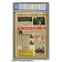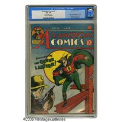 <B>All-American Comics #16 (DC, 1940) CGC VG- 3.5 Cream to off-white pages.</B></I> According to Overstreet, this is the fifth most valuable comic book of all, trailing only the "big four" of <B>Action Comics</B></I> #1, <B>Detective Comics</B></I> #27, <B>Marvel Comics</B></I> #1, and <B>Superman</B></I> #1. This one has the origin and first appearance of the original Green Lantern, Alan Scott. But why, you ask, is it valued higher than the debuts of other DC heroes? That has to do with the scarcity of the book: Overstreet calls it "rare," while Gerber gives it a 7, meaning "scarce." To date, CGC hasn't awarded a higher grade than FN- 5.5 for an unrestored copy, so a VG- is quite competitive with the rest of the field. The interior art on the GL story is by the character's Martin Nodell, credited as "Mart Dellon." While Nodell created the character, he got help on this issue's script from Bill Finger of Batman fame. The two came up with an appealing hero who spends this first story finding out the extent of his new powers (his major vulnerability was to anything made of wood). The issue's cover is by Sheldon Moldoff. Incidentally, the comic is far from an all-superhero affair -- the backup features include Mutt and Jeff as well as Sheldon Mayer's comic artist character Scribbly. CGC notes, "2 pieces of tape on cover." Overstreet 2004 VG 4.0 value = $18,286. CGC census 12/04: 3 in 3.5, 6 higher. <I>From the Northern Lights Collection.</B></I>