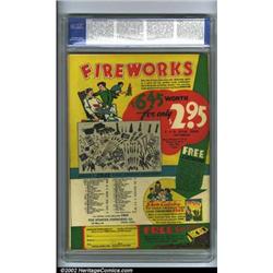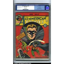 All-American Comics #27 (DC,1941). Chock full of great contents, All-American not only featured the Green Lantern, but Doctor Mid-Night, Red White and Blue, The Atom, Hop Harrigan, Scribbly & the Red Tornado, and even Mutt and Jeff. This issue is notable as the first appearance of the Lantern's long-running sidekick Doiby Dickles, who even appears in the GL costume on the fabulous cover, drawn by Howard Purcell. This is a stunning high-grade copy, the best copy certified as of this writing. This Golden Age key has bold, beautiful colors, with a deep red background and sharp greens and blue-grays. An absolutely gorgeous copy of this terrific issue. CGC VF+ 8.5 Off-white pages. Overstreet 2001 FN 6.0 value = $1,086; NM 9.4 value = $3,800. Important notice: We expect to be auctioning lots at the rate of 200-250 per hour. Sometimes eBay Premier live bid software cannot keep up with that pace, so we strongly recommend that you place a realistic proxy bid now as insurance to avoid disappointment. Also please note that all Heritage/CAA lots purchased through eBay Premier carry a 20% Buyer's Premium.