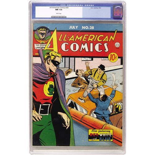 <B>All-American Comics #28 (DC, 1941) CGC NM 9.4 White pages.</B></I> You would swear that this copy came from the Mile High collection with its bright cover inks, white pages, and sharp corners. This difficult-to-find DC features Green Lantern (on the cover) as well as Doiby Dickles whacking a guy in the head with a pipe wrench. Inside, Hop Harrigan gives up his costumed I.D. The next closest book on the CGC census is an 8.0. Don't miss out on this chart-topping beauty! Overstreet 2006 NM- 9.2 value = $2,500. CGC census 3/07: 1 in 9.4, none higher.<BR><BR><b>Shipping:</b> Comics - Slabbed (certified) (<a target="_blank" href="http://www.heritageauctions.com/common/shipping.php">view shipping information</a>)