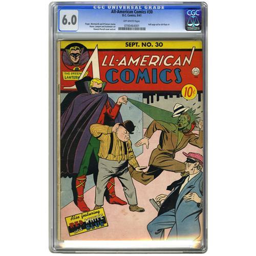 <B>All-American Comics #30 (DC, 1941) CGC FN 6.0 Off-white pages.</B></I> All you bad guys better not mess with Doiby -- especially when Green Lantern is standing behind him! This issue of <B>A-A</B></I> features story art by Irwin Hasen, Harry Lampert, and Howard Purcell (who also drew the cover illustration). And for you ad collectors, there's a half-page announcement for <B>All-Flash</B></I> #1 inside. Overstreet 2006 FN 6.0 value = $555. CGC census 3/06: 2 in 6.0, 5 higher.