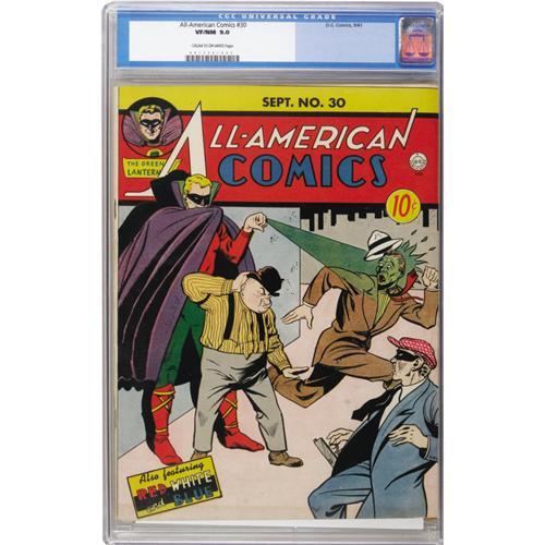 <B>All-American Comics #30 (DC, 1941) CGC VF/NM 9.0 Cream to off-white pages.</B></I> Here's an early appearance for Green Lantern's sidekick Doiby Dickles, who first appeared in #27. The cover is credited to Howard Purcell, and the GL story was drawn by Irwin Hasen. The Atom and Dr. Mid-Nite also appear in the issue. Overstreet 2006 VF/NM 9.0 value = $1,828; NM- 9.2 value = $2,500. CGC census 10/06: 2 in 9.0, none higher.<BR><BR><b>Shipping:</b> Slabbed Comic (<a target="_blank" href="http://www.heritageauctions.com/common/shipping.php">view shipping information</a>)