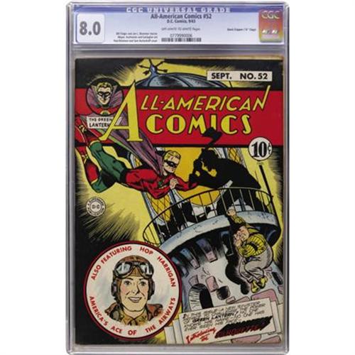<B>All-American Comics #52 "D" Copy pedigree (DC, 1943) CGC VF 8.0 Off-white to white pages.</B></I> Green Lantern cover by Paul Reinman. Atom, Dr. Mid-Nite, and Hop Harrigan appear. <BR>Overstreet 2007 VF 8.0 value = $594. CGC census 6/07: 1 in 8.0, 1 higher.<BR><BR><b>Shipping:</b> Comics - Slabbed (certified) (<a target="_blank" href="http://www.heritageauctions.com/common/shipping.php">view shipping information</a>)