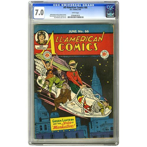<B>All-American Comics #66 (DC, 1945) CGC FN/VF 7.0 White pages.</B></I> Guess what, this FN/VF book is the highest-graded copy yet certified of this issue! Dr. Mid-Nite, Hop Harrigan, and others join Green Lantern and Doiby Dickles in these pages. The cover art is by Paul Reinman. Overstreet 2006 FN 6.0 value = $255; VF 8.0 value = $531. CGC census 3/06: 1 in 7.0, none higher.