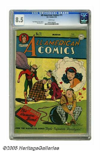 <B>All-American Comics #71 (DC, 1946) CGC VF+ 8.5 White pages.</B></I> This Gerber "uncommon" issue featured cover art by Paul Reinman, plus interior art by Reinman and Jon Blummer. Uncommon indeed - CGC has certified only one nicer copy of #71 to date. Overstreet 2005 VF 8.0 value = $431; VF/NM 9.0 value = $666. CGC census 5/05: 1 in 8.5, 1 higher.