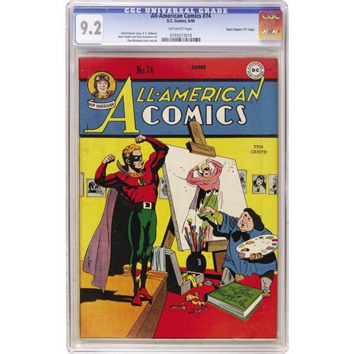 <B>All-American Comics #74 Davis Crippen ("D" Copy) pedigree (DC, 1946) CGC NM- 9.2 Off-white pages.</B></I> This copy's got one of the mysterious handwritten "D"s that gave this pedigree its original name... and while you're looking at that, note the superb condition of this copy! Green Lantern and Doiby Dickles are drawn by Paul Reinman on the cover. Dr. Mid-Nite appears in a backup feature. Overstreet 2006 NM- 9.2 value = $935. CGC census 3/07: 1 in 9.2, none higher.<BR><BR><b>Shipping:</b> Comics - Slabbed (certified) (<a target="_blank" href="http://www.heritageauctions.com/common/shipping.php">view shipping information</a>)