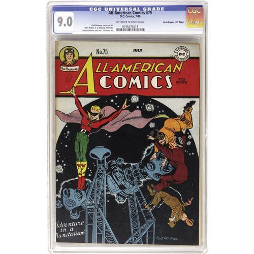 <B>All-American Comics #75 Davis Crippen ("D" Copy) pedigree (DC, 1946) CGC VF/NM 9.0 Off-white to white pages.</B></I> Paul Reinman handled both cover and interior art chores on Green Lantern. Dr. Mid-Nite appears in a backup feature. Overstreet 2006 VF/NM 9.0 value = $683; NM- 9.2 value = $935. CGC census 6/06: 2 in 9.0, higher. <I>From the Crippen Collection.</B></I> <BR><BR><B>Important notice:</B> Heritage usually auctions material at the rate of 200-250 lots per hour. On some occasions eBay Live bid software or the Internet may not be able to keep up with the pace of the auction. We recommend placing a realistic absentee bid now as insurance to avoid disappointment. Occasionally the auctioneer may eliminate or reject an eBay Live bid, and the auctioneer may also reopen a lot after the close of the eBay live bidding (usually because we missed an audience bid), and may reject your bid even if it shows you as the winning bidder. By bidding via eBay Live, you agree that Heritage may award the lot to another bidder at its sole discretion under the circumstances described above or any other reasonable circumstances. Since eBay bids are not shown to us until we open the lot on the floor, we treat those bids just like floor bids. In most cases the floor responds before the eBay bid is presented to us, due to Internet lag time, so for consistency we have made it a policy that floor bids are always considered first over tie eBay live bids. Also please note that all Heritage lots purchased through eBay Live carry a 22.5% Buyer's Premium. Please make sure you read the Terms and Conditions before you bid. This lot is being auctioned in conjunction with a live floor auction by Heritage Auction Galleries. All final auction and invoice information will be supplied by Heritage Auction Galleries, and all other information should be considered preliminary. Lot:41001 <BR><BR><B>Winning Notification and Billing:</B> After the FINAL session in this auction is complete, Heritage will send e-mail and snail mail invoices. This process normally takes several days. All final auction and invoice information will be supplied by Heritage Auction Galleries, and all other information should be considered preliminary. <BR><BR>This auction will be conducted on a live auction floor and over the Internet through eBay Live. If you choose to place an absentee bid, please take a moment to <font color='#0000ff'><u><a href='http://pages.ebay.com/liveauctions/help/before/laabsentee.html'>learn how eBay Live absentee bidding works</a></u></font><font color='#000000'>