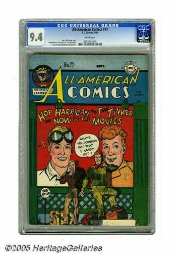 <B>All-American Comics #77 (DC, 1946) CGC NM 9.4 White pages.</B></I> Here's a pedigree-quality book that has no peer - at least according to CGC's most recent census. Underrated artist Jon Blummer contributed cover and story art for this issue. Overstreet 2005 NM- 9.2 value = $900. CGC census 5/05: 1 in 9.4, none higher.