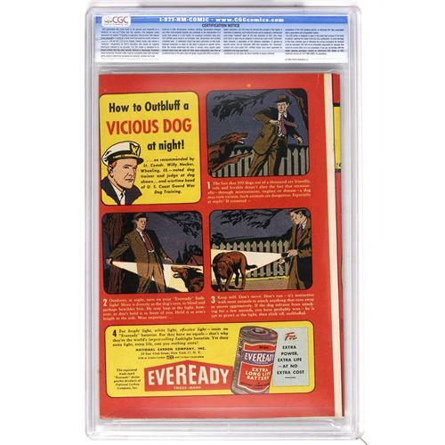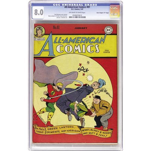 <B>All-American Comics #81 Davis Crippen ("D" Copy) pedigree (DC, 1947) CGC VF 8.0 Off-white to white pages.</B></I> Another great cover by Paul Reinman, one that begs the question "What hurts more: a sock in the kisser from a superhero or a cactus to the bum from his goofy sidekick?" The world may never know, but what's for certain is that this is one handsome specimen of this issue, one that ties with one other as CGC's top-graded copy. Gerber rates it a "6", "uncommon." Overstreet 2006 VF 8.0 value = $431. CGC census 7/06: 2 in 8.0, none higher. <I>From the Crippen Collection.</B></I> <BR><BR><B>Important notice:</B> Heritage usually auctions material at the rate of 200-250 lots per hour. On some occasions eBay Live bid software or the Internet may not be able to keep up with the pace of the auction. We recommend placing a realistic absentee bid now as insurance to avoid disappointment. Occasionally the auctioneer may eliminate or reject an eBay Live bid, and the auctioneer may also reopen a lot after the close of the eBay live bidding (usually because we missed an audience bid), and may reject your bid even if it shows you as the winning bidder. By bidding via eBay Live, you agree that Heritage may award the lot to another bidder at its sole discretion under the circumstances described above or any other reasonable circumstances. Since eBay bids are not shown to us until we open the lot on the floor, we treat those bids just like floor bids. In most cases the floor responds before the eBay bid is presented to us, due to Internet lag time, so for consistency we have made it a policy that floor bids are always considered first over tie eBay live bids. Also please note that all Heritage lots purchased through eBay Live carry a 22.5% Buyer's Premium. Please make sure you read the Terms and Conditions before you bid. This lot is being auctioned in conjunction with a live floor auction by Heritage Auction Galleries. All final auction and invoice information will be supplied by Heritage Auction Galleries, and all other information should be considered preliminary. Lot:41001 <BR><BR><B>Winning Notification and Billing:</B> After the FINAL session in this auction is complete, Heritage will send e-mail and snail mail invoices. This process normally takes several days. All final auction and invoice information will be supplied by Heritage Auction Galleries, and all other information should be considered preliminary. <BR><BR>This auction will be conducted on a live auction floor and over the Internet through eBay Live. If you choose to place an absentee bid, please take a moment to <font color='#0000ff'><u><a href='http://pages.ebay.com/liveauctions/help/before/laabsentee.html'>learn how eBay Live absentee bidding works</a></u></font><font color='#000000'>