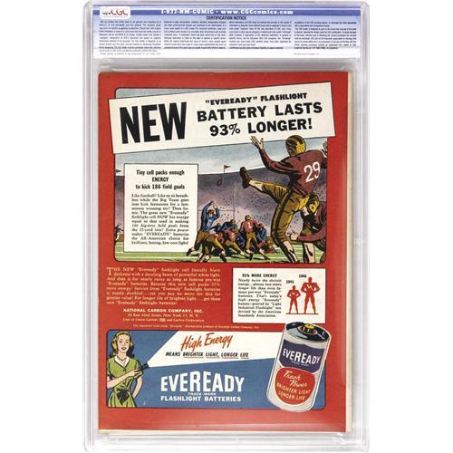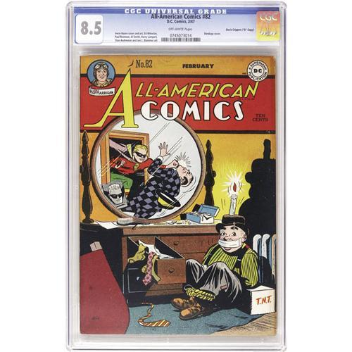 <B>All-American Comics #82 Davis Crippen ("D" Copy) pedigree (DC, 1947) CGC VF+ 8.5 Off-white pages.</B></I> The appealing style of Irwin Hasen graces this issue's unusual cover. In addition to the Green Lantern feature, the issue has Dr. Mid-Nite and Winky, Blinky, and Noddy. We hadn't ever offered this issue before, and it's nice to start with the highest-graded copy! Overstreet 2006 VF 8.0 value = $431; VF/NM 9.0 value = $683. CGC census 6/06: 1 in 8.5, none higher. <I>From the Crippen Collection.</B></I> <BR><BR><B>Important notice:</B> Heritage usually auctions material at the rate of 200-250 lots per hour. On some occasions eBay Live bid software or the Internet may not be able to keep up with the pace of the auction. We recommend placing a realistic absentee bid now as insurance to avoid disappointment. Occasionally the auctioneer may eliminate or reject an eBay Live bid, and the auctioneer may also reopen a lot after the close of the eBay live bidding (usually because we missed an audience bid), and may reject your bid even if it shows you as the winning bidder. By bidding via eBay Live, you agree that Heritage may award the lot to another bidder at its sole discretion under the circumstances described above or any other reasonable circumstances. Since eBay bids are not shown to us until we open the lot on the floor, we treat those bids just like floor bids. In most cases the floor responds before the eBay bid is presented to us, due to Internet lag time, so for consistency we have made it a policy that floor bids are always considered first over tie eBay live bids. Also please note that all Heritage lots purchased through eBay Live carry a 22.5% Buyer's Premium. Please make sure you read the Terms and Conditions before you bid. This lot is being auctioned in conjunction with a live floor auction by Heritage Auction Galleries. All final auction and invoice information will be supplied by Heritage Auction Galleries, and all other information should be considered preliminary. Lot:41001 <BR><BR><B>Winning Notification and Billing:</B> After the FINAL session in this auction is complete, Heritage will send e-mail and snail mail invoices. This process normally takes several days. All final auction and invoice information will be supplied by Heritage Auction Galleries, and all other information should be considered preliminary. <BR><BR>This auction will be conducted on a live auction floor and over the Internet through eBay Live. If you choose to place an absentee bid, please take a moment to <font color='#0000ff'><u><a href='http://pages.ebay.com/liveauctions/help/before/laabsentee.html'>learn how eBay Live absentee bidding works</a></u></font><font color='#000000'>