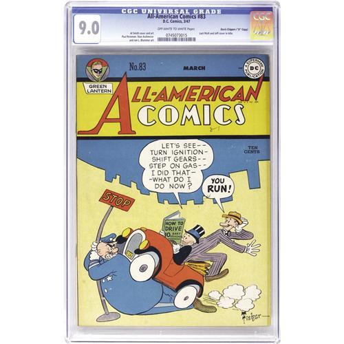 <B>All-American Comics #83 Davis Crippen ("D" Copy) pedigree (DC, 1947) CGC VF/NM 9.0 Off-white to white pages.</B></I> Did Maurice Sendak of <B>Where The Wild Things Are</B></I> fame draw this issue's cover? Gerber attributes it as such, and that's plausible, as Sendak did assist Bud Fisher on the Mutt and Jeff strip. This is one of only two times Mutt and Jeff were the sole cover feature, even though they appeared in this series exactly 100 times! Green Lantern and Dr. Mid-Nite are the superheroes of the issue. This is a superb copy that's unsurprisingly the census-topper. Overstreet 2006 VF/NM 9.0 value = $683; NM- 9.2 value = $935. CGC census 6/06: 1 in 9.0, none higher. <I>From the Crippen Collection.</B></I> <BR><BR><B>Important notice:</B> Heritage usually auctions material at the rate of 200-250 lots per hour. On some occasions eBay Live bid software or the Internet may not be able to keep up with the pace of the auction. We recommend placing a realistic absentee bid now as insurance to avoid disappointment. Occasionally the auctioneer may eliminate or reject an eBay Live bid, and the auctioneer may also reopen a lot after the close of the eBay live bidding (usually because we missed an audience bid), and may reject your bid even if it shows you as the winning bidder. By bidding via eBay Live, you agree that Heritage may award the lot to another bidder at its sole discretion under the circumstances described above or any other reasonable circumstances. Since eBay bids are not shown to us until we open the lot on the floor, we treat those bids just like floor bids. In most cases the floor responds before the eBay bid is presented to us, due to Internet lag time, so for consistency we have made it a policy that floor bids are always considered first over tie eBay live bids. Also please note that all Heritage lots purchased through eBay Live carry a 22.5% Buyer's Premium. Please make sure you read the Terms and Conditions before you bid. This lot is being auctioned in conjunction with a live floor auction by Heritage Auction Galleries. All final auction and invoice information will be supplied by Heritage Auction Galleries, and all other information should be considered preliminary. Lot:41001 <BR><BR><B>Winning Notification and Billing:</B> After the FINAL session in this auction is complete, Heritage will send e-mail and snail mail invoices. This process normally takes several days. All final auction and invoice information will be supplied by Heritage Auction Galleries, and all other information should be considered preliminary. <BR><BR>This auction will be conducted on a live auction floor and over the Internet through eBay Live. If you choose to place an absentee bid, please take a moment to <font color='#0000ff'><u><a href='http://pages.ebay.com/liveauctions/help/before/laabsentee.html'>learn how eBay Live absentee bidding works</a></u></font><font color='#000000'>
