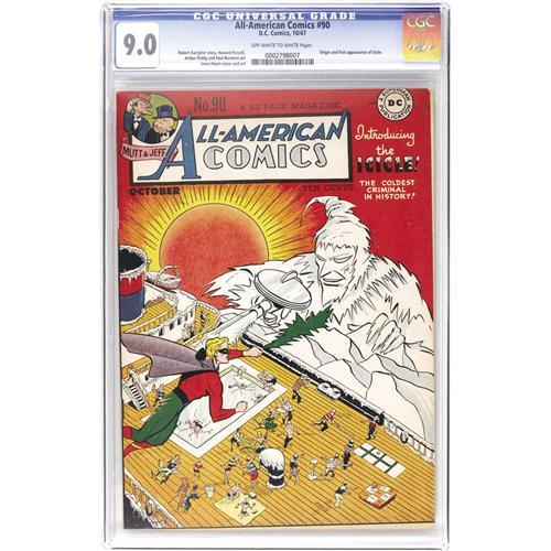 <B>All-American Comics #90 (DC, 1947) CGC VF/NM 9.0 Off-white to white pages.</B></I> Another issue that we seldom see is this issue from near the end of this title's run, and this VF/NM specimen is among the nicest yet certified. It's got the first appearance of the Icicle, who would become a DC standby in the villain department, joining the Injustice Society and even figuring into the <B>Crisis On Infinite Earths</B></I>. Green Lantern has to deal with that frosty fellow, and there are backup features starring Dr. Mid-Nite, the Black Pirate, Mutt and Jeff, and Hop Harrigan. The cover is by Irwin Hasen. Overstreet 2006 VF/NM 9.0 value = $1,078; NM- 9.2 value = $1,475. CGC census 5/06: 1 in 9.0, 1 higher. <BR><BR><B>Important notice:</B> Heritage usually auctions material at the rate of 200-250 lots per hour. On some occasions eBay Live bid software or the Internet may not be able to keep up with the pace of the auction. We recommend placing a realistic absentee bid now as insurance to avoid disappointment. Occasionally the auctioneer may eliminate or reject an eBay Live bid, and the auctioneer may also reopen a lot after the close of the eBay live bidding (usually because we missed an audience bid), and may reject your bid even if it shows you as the winning bidder. By bidding via eBay Live, you agree that Heritage may award the lot to another bidder at its sole discretion under the circumstances described above or any other reasonable circumstances. Since eBay bids are not shown to us until we open the lot on the floor, we treat those bids just like floor bids. In most cases the floor responds before the eBay bid is presented to us, due to Internet lag time, so for consistency we have made it a policy that floor bids are always considered first over tie eBay live bids. Also please note that all Heritage lots purchased through eBay Live carry a 22.5% Buyer's Premium. Please make sure you read the Terms and Conditions before you bid. This lot is being auctioned in conjunction with a live floor auction by Heritage Auction Galleries. All final auction and invoice information will be supplied by Heritage Auction Galleries, and all other information should be considered preliminary. Lot:41001 <BR><BR><B>Winning Notification and Billing:</B> After the FINAL session in this auction is complete, Heritage will send e-mail and snail mail invoices. This process normally takes several days. All final auction and invoice information will be supplied by Heritage Auction Galleries, and all other information should be considered preliminary. <BR><BR>This auction will be conducted on a live auction floor and over the Internet through eBay Live. If you choose to place an absentee bid, please take a moment to <font color='#0000ff'><u><a href='http://pages.ebay.com/liveauctions/help/before/laabsentee.html'>learn how eBay Live absentee bidding works</a></u></font><font color='#000000'>