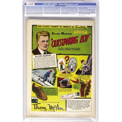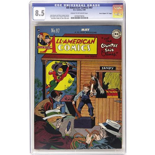 <B>All-American Comics #97 Davis Crippen ("D" Copy) pedigree (DC, 1948) CGC VF+ 8.5 Cream to off-white pages.</B></I> This is the first time we'd seen this issue from late in the run, and we were missing out on a cover by the late, great Alex Toth! Toth even snuck in a signature, with the horse's nameplate reading "Sandy," the nickname of Mr. Toth! Green Lantern and Dr. Mid-Nite are the heroes of the issue. Overstreet 2006 VF 8.0 value = $681; VF/NM 9.0 value = $1,078. CGC census 6/06: 1 in 8.5, 1 higher. <I>From the Crippen Collection.</B></I> <BR><BR><B>Important notice:</B> Heritage usually auctions material at the rate of 200-250 lots per hour. On some occasions eBay Live bid software or the Internet may not be able to keep up with the pace of the auction. We recommend placing a realistic absentee bid now as insurance to avoid disappointment. Occasionally the auctioneer may eliminate or reject an eBay Live bid, and the auctioneer may also reopen a lot after the close of the eBay live bidding (usually because we missed an audience bid), and may reject your bid even if it shows you as the winning bidder. By bidding via eBay Live, you agree that Heritage may award the lot to another bidder at its sole discretion under the circumstances described above or any other reasonable circumstances. Since eBay bids are not shown to us until we open the lot on the floor, we treat those bids just like floor bids. In most cases the floor responds before the eBay bid is presented to us, due to Internet lag time, so for consistency we have made it a policy that floor bids are always considered first over tie eBay live bids. Also please note that all Heritage lots purchased through eBay Live carry a 22.5% Buyer's Premium. Please make sure you read the Terms and Conditions before you bid. This lot is being auctioned in conjunction with a live floor auction by Heritage Auction Galleries. All final auction and invoice information will be supplied by Heritage Auction Galleries, and all other information should be considered preliminary. Lot:41001 <BR><BR><B>Winning Notification and Billing:</B> After the FINAL session in this auction is complete, Heritage will send e-mail and snail mail invoices. This process normally takes several days. All final auction and invoice information will be supplied by Heritage Auction Galleries, and all other information should be considered preliminary. <BR><BR>This auction will be conducted on a live auction floor and over the Internet through eBay Live. If you choose to place an absentee bid, please take a moment to <font color='#0000ff'><u><a href='http://pages.ebay.com/liveauctions/help/before/laabsentee.html'>learn how eBay Live absentee bidding works</a></u></font><font color='#000000'>