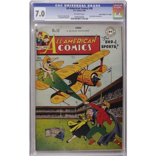 <B>All-American Comics #98 Davis Crippen ("D" Copy) pedigree (DC, 1948) CGC FN/VF 7.0 Off-white pages.</B></I> Alex Toth delivered the exciting cover art here -- the villain is the Sportsmaster, whom Silver Age fans may remember from <B>The Brave and the Bold</B></I> #62. Overstreet 2006 FN 6.0 value = $327; VF 8.0 value = $681. CGC census 9/06: 1 in 7.0, 1 higher. <I>From the Crippen Collection</B></I>.<BR><BR><b>Shipping:</b> Slabbed Comic (<a target="_blank" href="http://www.heritageauctions.com/common/shipping.php">view shipping information</a>)