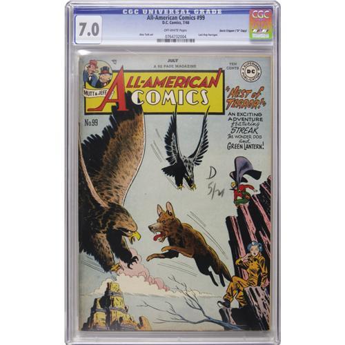 <B>All-American Comics #99 Davis Crippen ("D" Copy) pedigree (DC, 1948) CGC FN/VF 7.0 Off-white pages.</B></I> This was Green Lantern's last cover appearance of the series (vignettes aside) as well as being one of the final issues of the title, which ended with #102. GL even takes a backseat to Streak the Wonder Dog here, but the cover artistry is that of one of the all-time greats, namely Alex Toth. Overstreet 2006 FN 6.0 value = $327; VF 8.0 value = $681. CGC census 9/06: 2 in 7.0, 1 higher. <I>From the Crippen Collection</B></I>.<BR><BR><b>Shipping:</b> Slabbed Comic (<a target="_blank" href="http://www.heritageauctions.com/common/shipping.php">view shipping information</a>)