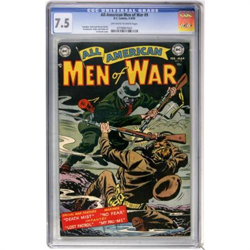 <B>All-American Men of War #9 (DC, 1954) CGC VF- 7.5 Off-white to white pages.</B></I> Ross Andru and Gene Colan art. Irv Novick cover. Overstreet 2007 VF 8.0 value = $255. CGC census 6/07: 1 in 7.5, none higher. <I>From the Keith Marlow Collection.</B></I><BR><BR><b>Shipping:</b> Comics - Slabbed (certified) (<a target="_blank" href="http://www.heritageauctions.com/common/shipping.php">view shipping information</a>)