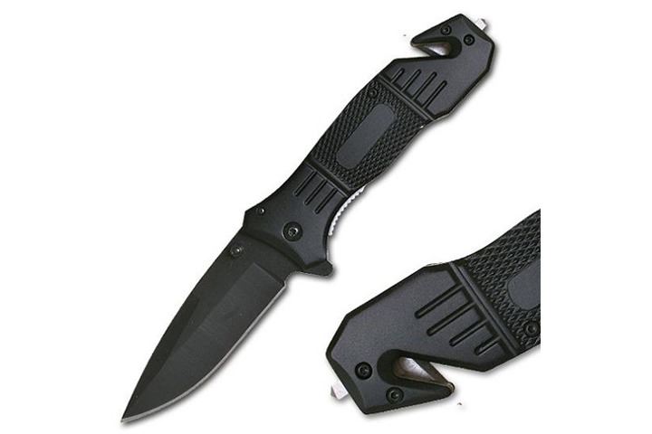 This quality knife comes with a clip and is 4.5" Closed . High quality knife for a low price. Features a seat belt cord cutter and window breaker.