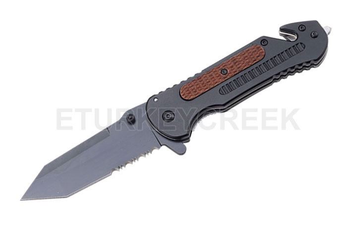 Black half serrated tanto Blade With Wood Overlay handle. Window breaker on end of handle.Sharpened high carbon steel tanto blade with black finish.In-line open lock.Includes pocket / boot clip.Seat belt and cord cutter. 3.5" blade, 4.5" overall closed in length