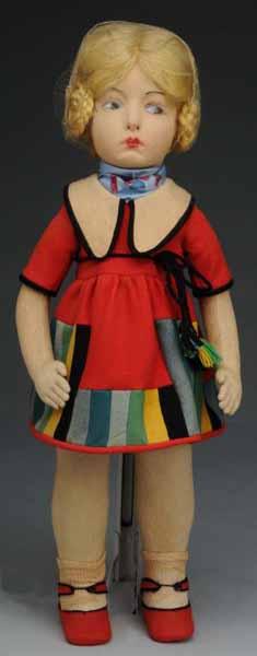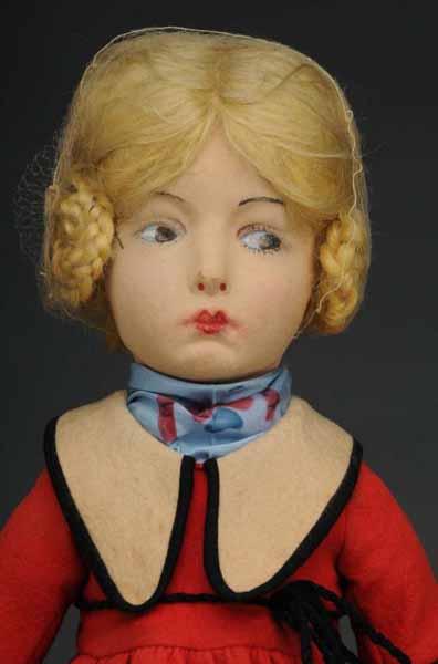Description Italy, Ca. 1920. Molded felt face, painted features (smeary mouth), mohair wig with coiled side braids. Jointed neck, shoulders and hips, chubby torso and legs. All original dress of pieced colorful felt, original undies, shoes and socks, too. Some fading. Condition (Good). Size 24" T.