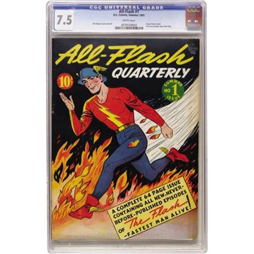 <B>All-Flash #1 (DC, 1941) CGC VF- 7.5 White pages.</B></I> DC's Fastest Man Alive gets his first solo title (in the older <B>Flash Comics</B></I>, he had to share interior space with the likes of Hawkman, Johnny Thunder, and others) with art by E. E. Hibbard, and a retelling of his origin. Sheldon Mayer drew the Hop Harrigan back-up feature. This key issue checks in at #44 in Overstreet's 2005 list of Top Golden Age Books. This is a very attractive copy, with bright, rich cover colors contrasted by a deep black background, and supple white interior pages. Overstreet 2007 VF 8.0 value = $10,628. CGC census 6/07: 2 in 7.5, 9 higher.<BR><BR><b>Shipping:</b> Comics - Slabbed (certified) (<a target="_blank" href="http://www.heritageauctions.com/common/shipping.php">view shipping information</a>)