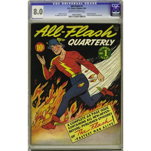<B>All-Flash #1 (DC, 1941) CGC VF 8.0 Cream to off-white pages.</B></I> The Fastest Man Alive comes zooming your way in his first solo comic, which currently ranks #44 in Overstreet's list of Top Golden Age Books. E. E. Hibbard drew the Flash cover and stories, which include a retelling of the Flash's origin, while Sheldon Mayer handled the art for a Hop Harrigan tale, and Ed Wheelan provided a two-page humorous filler feature. This copy, with its black background and vivid cover colors, looks spectacular; however, those eagle-eyed folks at CGC note, "Small amount of dried glue on cover." Overstreet 2006 VF 8.0 value = $10,628. CGC census 5/06: 5 in 8.0, 4 higher. <BR><BR><B>Important notice:</B> Heritage usually auctions material at the rate of 200-250 lots per hour. On some occasions eBay Live bid software or the Internet may not be able to keep up with the pace of the auction. We recommend placing a realistic absentee bid now as insurance to avoid disappointment. Occasionally the auctioneer may eliminate or reject an eBay Live bid, and the auctioneer may also reopen a lot after the close of the eBay live bidding (usually because we missed an audience bid), and may reject your bid even if it shows you as the winning bidder. By bidding via eBay Live, you agree that Heritage may award the lot to another bidder at its sole discretion under the circumstances described above or any other reasonable circumstances. Since eBay bids are not shown to us until we open the lot on the floor, we treat those bids just like floor bids. In most cases the floor responds before the eBay bid is presented to us, due to Internet lag time, so for consistency we have made it a policy that floor bids are always considered first over tie eBay live bids. Also please note that all Heritage lots purchased through eBay Live carry a 22.5% Buyer's Premium. Please make sure you read the Terms and Conditions before you bid. This lot is being auctioned in conjunction with a live floor auction by Heritage Auction Galleries. All final auction and invoice information will be supplied by Heritage Auction Galleries, and all other information should be considered preliminary. Lot:41001 <BR><BR><B>Winning Notification and Billing:</B> After the FINAL session in this auction is complete, Heritage will send e-mail and snail mail invoices. This process normally takes several days. All final auction and invoice information will be supplied by Heritage Auction Galleries, and all other information should be considered preliminary. <BR><BR>This auction will be conducted on a live auction floor and over the Internet through eBay Live. If you choose to place an absentee bid, please take a moment to <font color='#0000ff'><u><a href='http://pages.ebay.com/liveauctions/help/before/laabsentee.html'>learn how eBay Live absentee bidding works</a></u></font><font color='#000000'>
