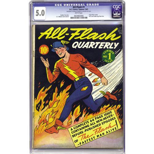 <B>All-Flash #1 (DC, 1941) CGC VG/FN 5.0 White pages.</B></I> Yes, the Flash was already seen in every issue of <B>Flash Comics</B></I>, but he had to share the book with other heroes; this title was <I>all</B></I> Flash, 64 pages of him in fact. And anyone who was new to the character got a refresher in this issue on how Jay Garrick got his powers. The book has E. E. Hibbard cover and interior art. There's even a brief biographical feature on Hibbard and writer Gardner Fox inside the mag. This key comic is ranked among the fifty most valuable Golden Age comic books by Overstreet. CGC notes, "Small piece of cardboard attached to centerfold with glue." Overstreet 2006 VG 4.0 value = $2,834; FN 6.0 value = $4,251. CGC census 6/06: 3 in 5.0, 22 higher. <BR><BR><B>Important notice:</B> Heritage usually auctions material at the rate of 200-250 lots per hour. On some occasions eBay Live bid software or the Internet may not be able to keep up with the pace of the auction. We recommend placing a realistic absentee bid now as insurance to avoid disappointment. Occasionally the auctioneer may eliminate or reject an eBay Live bid, and the auctioneer may also reopen a lot after the close of the eBay live bidding (usually because we missed an audience bid), and may reject your bid even if it shows you as the winning bidder. By bidding via eBay Live, you agree that Heritage may award the lot to another bidder at its sole discretion under the circumstances described above or any other reasonable circumstances. Since eBay bids are not shown to us until we open the lot on the floor, we treat those bids just like floor bids. In most cases the floor responds before the eBay bid is presented to us, due to Internet lag time, so for consistency we have made it a policy that floor bids are always considered first over tie eBay live bids. Also please note that all Heritage lots purchased through eBay Live carry a 22.5% Buyer's Premium. Please make sure you read the Terms and Conditions before you bid. This lot is being auctioned in conjunction with a live floor auction by Heritage Auction Galleries. All final auction and invoice information will be supplied by Heritage Auction Galleries, and all other information should be considered preliminary. Lot:41001 <BR><BR><B>Winning Notification and Billing:</B> After the FINAL session in this auction is complete, Heritage will send e-mail and snail mail invoices. This process normally takes several days. All final auction and invoice information will be supplied by Heritage Auction Galleries, and all other information should be considered preliminary. <BR><BR>This auction will be conducted on a live auction floor and over the Internet through eBay Live. If you choose to place an absentee bid, please take a moment to <font color='#0000ff'><u><a href='http://pages.ebay.com/liveauctions/help/before/laabsentee.html'>learn how eBay Live absentee bidding works</a></u></font><font color='#000000'>