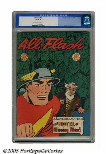 <B>All-Flash #18 (DC, 1945) CGC VF 8.0 Off-white pages.</B></I> While the comics of All-American Publications carried the DC logo more often than not, this one actually bears the seldom-seen "AA" seal. Martin Naydel drew the cover as well as the Flash stories, and there's some comedy provided by Winky, Blinky, and Noddy (as guest-stars) and also Mutt and Jeff (in their own feature). Overstreet 2005 VF 8.0 value = $469. CGC census 4/05: 1 in 8.0, 5 higher.