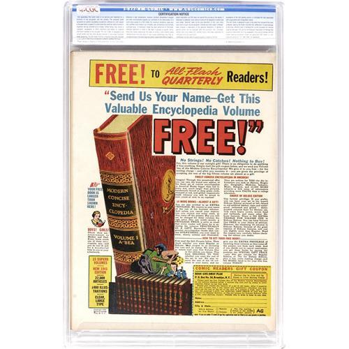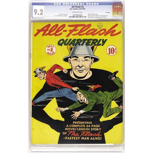 <B>All-Flash #2 "D" Copy pedigree (DC, 1941) CGC NM- 9.2 Off-white pages.</B></I> Before fandom at large knew that the "D" copies were collected by a man named Davis Crippen, a small portion of the books (like this one here) reached the open market under somewhat mysterious circumstances, wowing collectors with their outstanding condition. Provenance aside, this one's near the top of the census for good reason (only the Mile High copy tops it). E. E. Hibbard drew the cover as well as the interior stories of this comic which is <I>all</B></I> Flash... well, except for a two-pager featuring Butch McLobster the Super Mobster. There's also a recap of the origin of our favorite helmeted speedster. Overstreet 2006 NM- 9.2 value = $5,500. CGC census 6/06: 1 in 9.2, 1 higher. <BR><BR><B>Important notice:</B> Heritage usually auctions material at the rate of 200-250 lots per hour. On some occasions eBay Live bid software or the Internet may not be able to keep up with the pace of the auction. We recommend placing a realistic absentee bid now as insurance to avoid disappointment. Occasionally the auctioneer may eliminate or reject an eBay Live bid, and the auctioneer may also reopen a lot after the close of the eBay live bidding (usually because we missed an audience bid), and may reject your bid even if it shows you as the winning bidder. By bidding via eBay Live, you agree that Heritage may award the lot to another bidder at its sole discretion under the circumstances described above or any other reasonable circumstances. Since eBay bids are not shown to us until we open the lot on the floor, we treat those bids just like floor bids. In most cases the floor responds before the eBay bid is presented to us, due to Internet lag time, so for consistency we have made it a policy that floor bids are always considered first over tie eBay live bids. Also please note that all Heritage lots purchased through eBay Live carry a 22.5% Buyer's Premium. Please make sure you read the Terms and Conditions before you bid. This lot is being auctioned in conjunction with a live floor auction by Heritage Auction Galleries. All final auction and invoice information will be supplied by Heritage Auction Galleries, and all other information should be considered preliminary. Lot:41001 <BR><BR><B>Winning Notification and Billing:</B> After the FINAL session in this auction is complete, Heritage will send e-mail and snail mail invoices. This process normally takes several days. All final auction and invoice information will be supplied by Heritage Auction Galleries, and all other information should be considered preliminary. <BR><BR>This auction will be conducted on a live auction floor and over the Internet through eBay Live. If you choose to place an absentee bid, please take a moment to <font color='#0000ff'><u><a href='http://pages.ebay.com/liveauctions/help/before/laabsentee.html'>learn how eBay Live absentee bidding works</a></u></font><font color='#000000'>