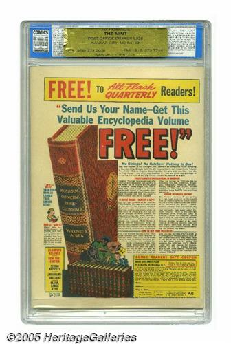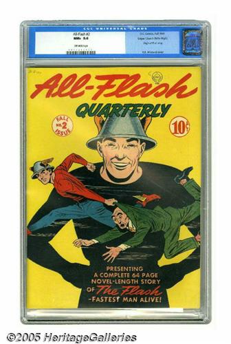 <B>All-Flash #2 Mile High pedigree (DC, 1941) CGC NM+ 9.6 Off-white pages.</B></I> The Fastest Man Alive almost whizzes past this cover, as he carries a collared crook straight to the clink. These Golden Age <B>All-Flash</B></I> comics actually seem more like graphic novels by today's standards -- instead of four separate tales, this has one long story between its covers (this one even recaps the Flash's origin). And be careful gazing at the brilliant yellow-background cover; better put on sunglasses first! Yes, this is a typically terrific Edgar Church Mile High comic, and yes, it's the highest graded copy to date according to CGC. Note that the very small white speck you might see near the bottom of this book is not a flaw, but a bit of plastic loose inside the CGC holder that does not compromise the integrity of the holder or affect the comic. Overstreet 2005 NM- 9.2 value = $5,000. CGC census 7/05: 1 in 9.6, none higher.