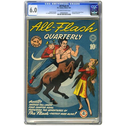 <B>All-Flash #3 (DC, 1941) CGC FN 6.0 Off-white to white pages.</B></I> "The Adventure of the Savage Centaurs, " illustrated on this E. E. Hibbard cover, is just one installment of this issue's book-length Flash tale. CGC notes that the book has ads for <B>All Star Comics</B></I> #8 and <B>Sensation Comics</B></I> #1 -- what a great time this was to be buying comics! Overstreet 2006 FN 6.0 value = $534. CGC census 3/06: 2 in 6.0, 6 higher.