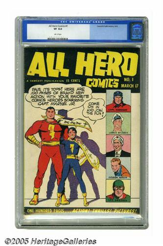 <B>All Hero Comics #1 (Fawcett, 1943) CGC VF 8.0 White pages.</B></I> This awesome square bound biggie comic featured Captain Marvel Jr., Captain Midnight, Lance O'Casey, Ibis the Invincible, Spy Smasher, Golden Arrow, and the first Banshee O'Brien. Mac Raboy styled the cover. This copy currently ranks as the third finest to be certified by CGC of the one-shot comic book. Overstreet 2005 VF 8.0 value = $1,056. CGC census 5/05: 1 in 8.0, 2 higher.