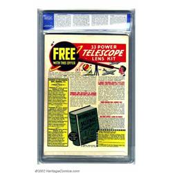 All Hero Comics #1 (Fawcett, 1943) CGC VF+ 8.5 Off-white to white pages. It's a bit far-fetched to think anyone would have been enamored with cardboard covers as late as 1943, but Fawcett tried this one-shot, which did feature several of their top characters. The result for collectordom is the same dearth of nice copies surviving today, much akin to early copies of World's Finest Comics, because of the inflexible covers and squarebound binding process. This is by far the nicest copy yet graded by CGC, and just might be the best in existence. Based on Overstreet's current value listing, this book has been overlooked and is relatively undervalued. Don't make the same mistake! Overstreet 2002 VF 8.0 value = $1,023. Important notice: We expect to be auctioning lots at the rate of 200-250 per hour. Sometimes eBay Premier live bid software cannot keep up with that pace, so we strongly recommend that you place a realistic proxy bid now as insurance to avoid disappointment. Also please note that all Heritage/CAA lots purchased through eBay Premier carry a 20% Buyer's Premium. Please make sure you read the Terms and Conditions.