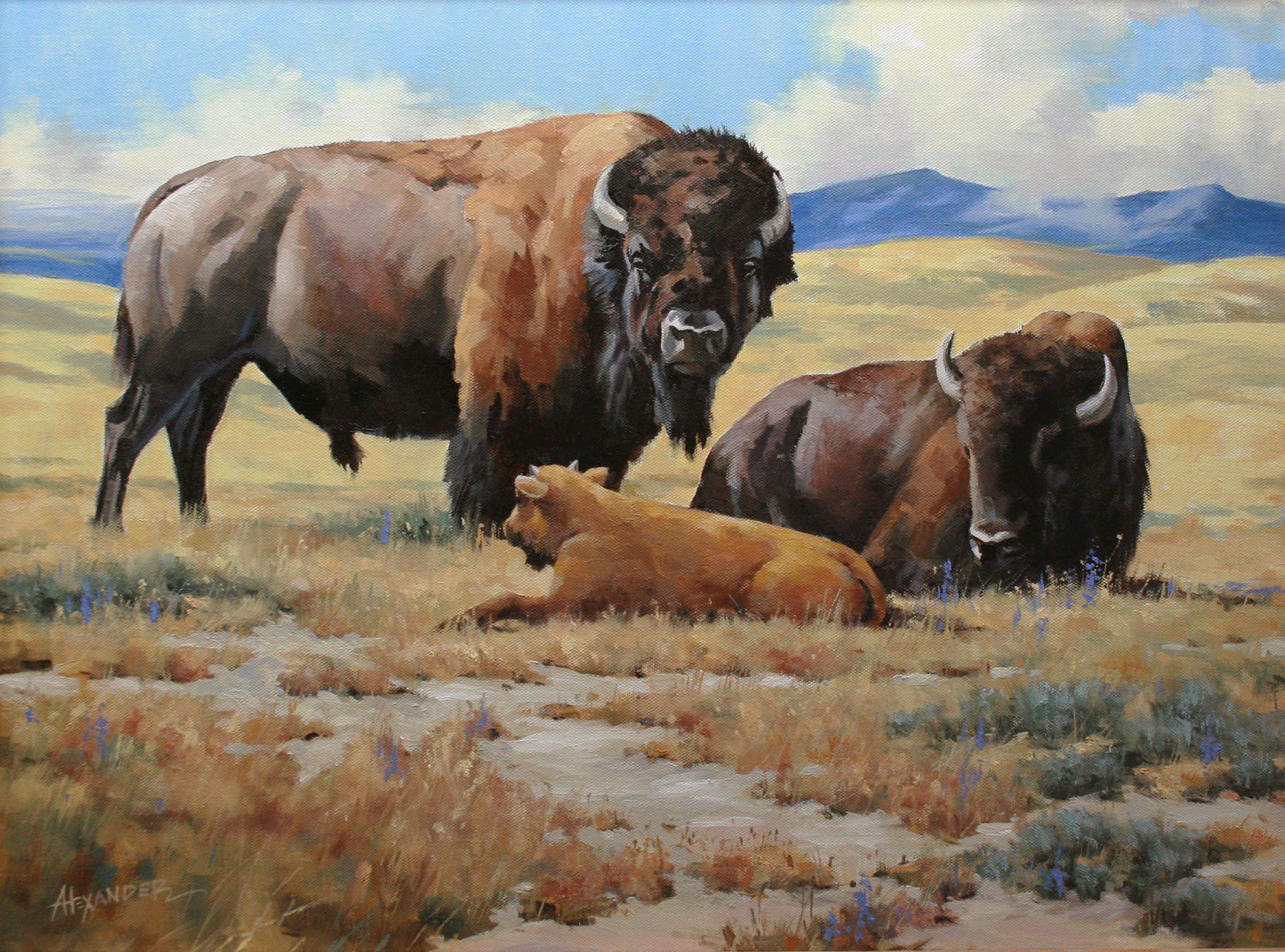 Artist: Colin Alexander. Title: All In The Family. Artwork size: 18" x 24". Frame: 25" x 31". Medium: Oil. Artist's description: I wanted to create a simple bison piece showing the bull, cow and the calf in their typical western environment.