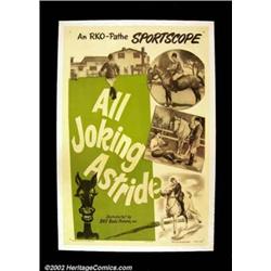 All Joking Astride (RKO 1953) One Sheet (27" X 41") Rare poster for RKO equestrian short subject.  Very Fine+ Linen. Very Fine on Linen.Important notice: We expect to be auctioning lots at the rate of 200-250 per hour. Sometimes eBay Premier live bid software cannot keep up with that pace, so we strongly recommend that you place a realistic proxy bid now as insurance to avoid disappointment. Also please note that all Heritage/CAA lots purchased through eBay Premier carry a 20% Buyer's Premium.