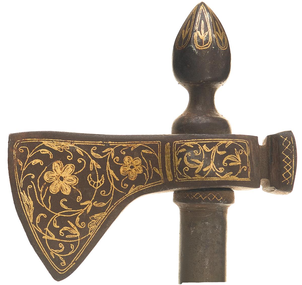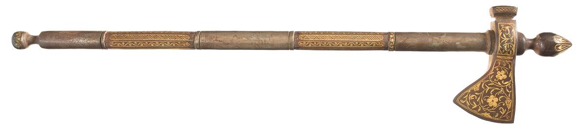 Iron construction, 24" in height with a 5" long head and 2 5/8" long ax edge, backed by a hammer style rear poll. The round shaft has an "onion" shaped faceted top, a pair of 4" long octagonal grip sections and a ball shaped pommel. Decorated with gold wire, with scroll and floral designs on the top and head, along with vine work and zig-zag designs on the grip flats and scrolls on the pommel.