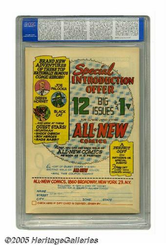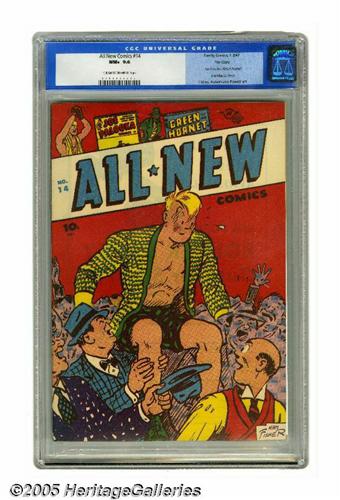 <B>All-New Comics #14 File Copy (Harvey, 1946) CGC NM+ 9.6 Cream to off-white pages.</B></I> This issue published by Family Comics, aka Harvey, stars Joe Palooka by Ham Fisher and Bob Powell's Man in Black, and there's also a Green Hornet story drawn by Harvey standby Al Avison. This file copy is the highest-graded that CGC has certified to date, in fact, it's the only one graded above 8.5 as of this writing. Overstreet 2005 NM- 9.2 value = $760. CGC census 6/05: 1 in 9.6, none higher.