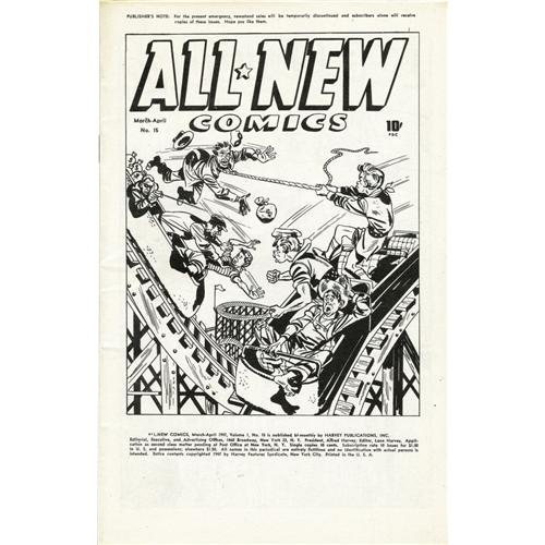 <B>All-New Comics #15 File Copy (Harvey, 1947) Condition: NM-.</B></I> Just try to find this incredibly hard-to-find issue anywhere else -- it received a scarcity rating of "10," or "unique" in Gerber's <B>Photo-Journal</B></I>, the highest scarcity rating the author assigned. That's because this 32-pager, measuring 5 1/2" by 8 1/2", was distributed to mail subscribers only. There's a notation on the first page that reads "For the present emergency, newsstand sales will be temporarily discontinued and subscribers alone will receive copies of these issues." The emergency in question was simply a glut of comics on the stands, resulting in newsdealers shunning less popular titles. Thus, this book, <B>Stuntman</B></I>, and a couple of others were phased out in this fashion, while the "emergency" didn't affect the likes of <B>Green Hornet Comics</B></I> or <B>Black Cat Comics</B></I>. Speaking of the Black Cat, she appears in this issue, as does Joe Palooka. Not appearing are the Boy Heroes, which is odd because they're featured on the cover! Note that CGC will not encapsulate any copy of this comic because it is considered all but impossible to authenticate. This copy's provenance as a Harvey File Copy allows you to bid with confidence! Overstreet 2006 NM- 9.2 value = $1,350.