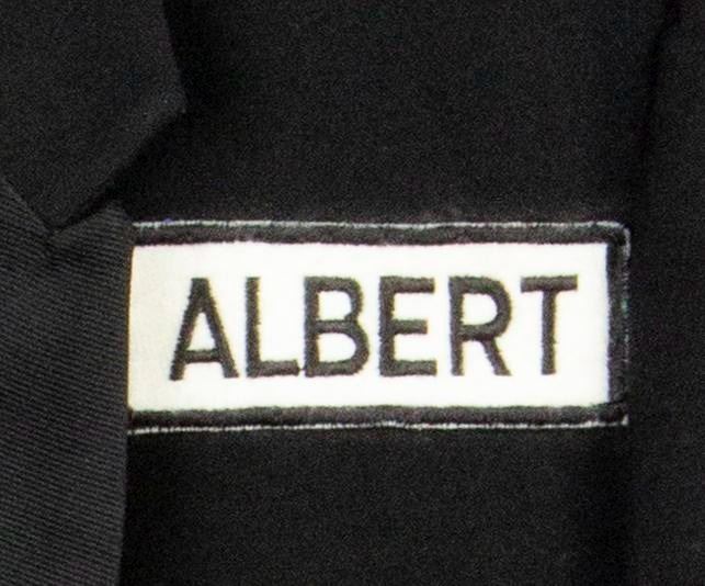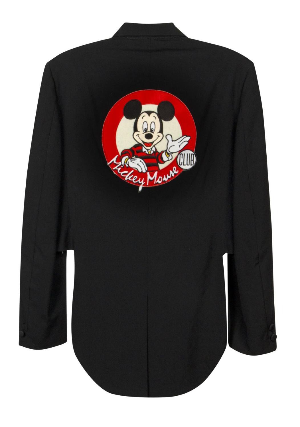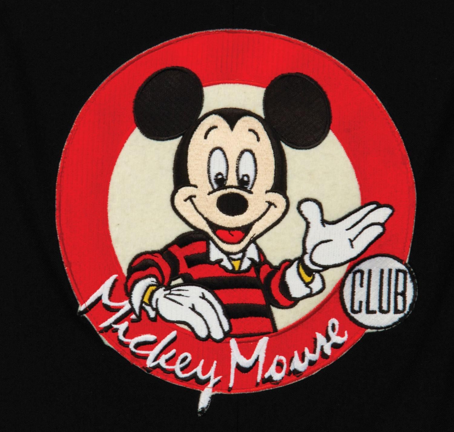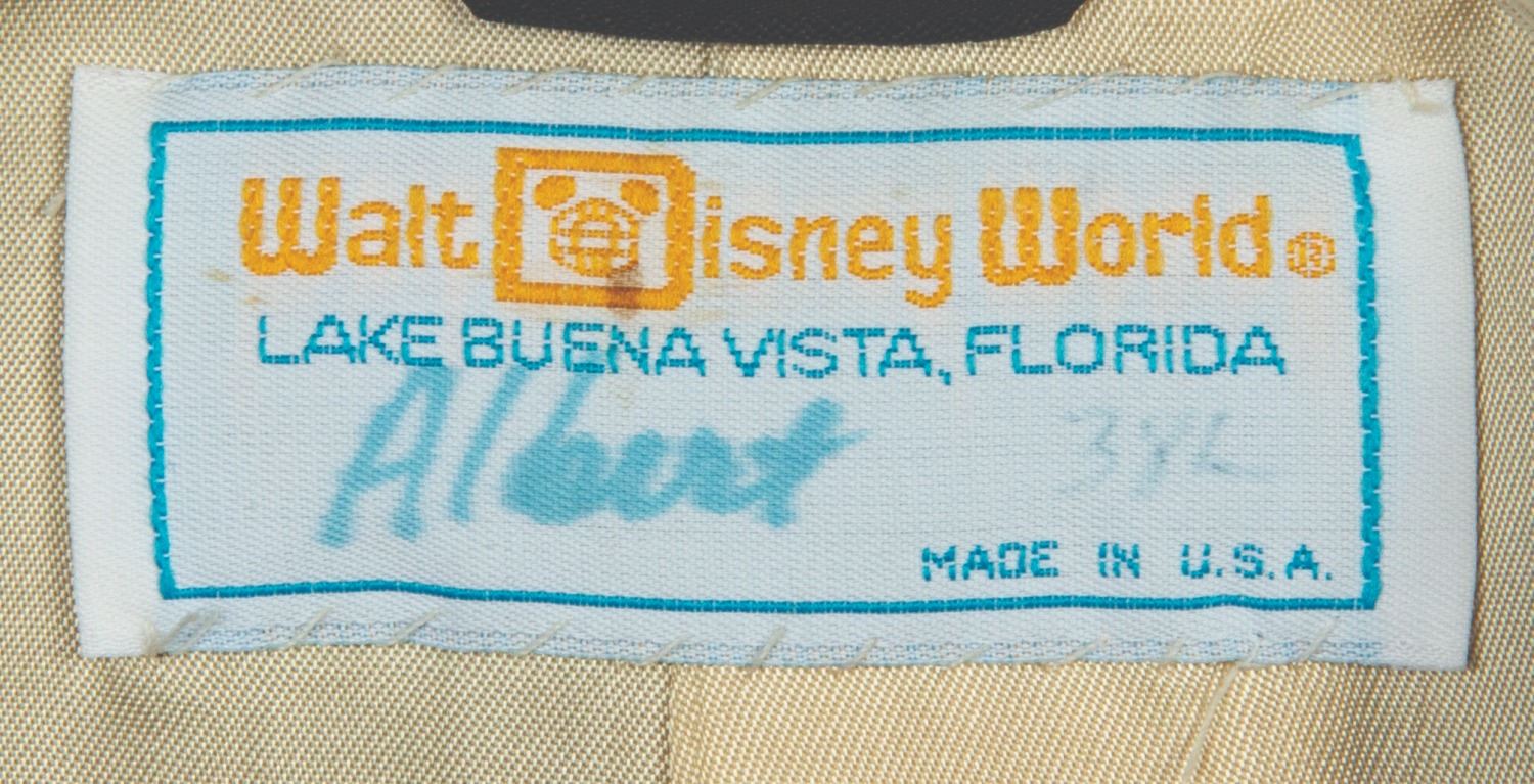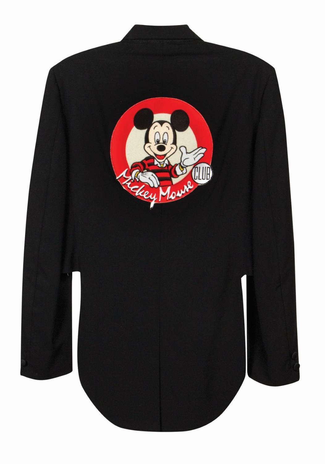 (Walt Disney Studios, c.1989) A tuxedo jacket custom labeled for Albert Fields of The All-New Mickey Mouse Club. This iteration of the Mickey Mouse Club included such memorable Mouseketeers as Britney Spears, Christina Aguilera, Justin Timberlake, Ryan Gosling, and many others. This jacket is a Calvin Klein brand jacket that has been altered with Albert's name on the front and a large All-New Mickey Mouse Club logo patch on the back. Marked as a size 38L, the jacket is in fair to good condition with some wear and a few small spots of discoloration from use.