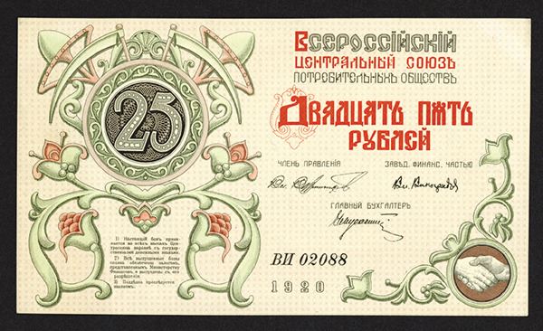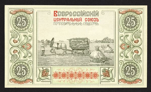 Russia. 25 Rubles, P-Unlisted, Black, light green, beige and red design, back with horse pulling hay wagon in fields, Uncirculated to CU. Attractive and rare note.