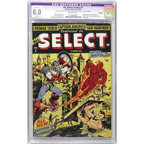 <B>All Select Comics #1 (Timely, 1943) CGC Apparent VF 8.0 Slight (P) Off-white pages.</B></I> This Alex Schomburg Timely cover is among the artist's most memorable, as it's got one of the most dynamic portrayals of the Big Three of Captain America, the Human Torch, and the Sub-Mariner. The fact that they're trashing Hitler's Berghof hideaway doesn't hurt! CGC notes, "Restoration includes: color touch, piece added, cover reinforced. (Right edge trimmed.)." Overstreet 2006 GD 2.0 value = $1,167; VG 4.0 value = $2,334; FN 6.0 value = $3,501; VF 8.0 value = $8,753.<BR><BR><b>Shipping:</b> Slabbed Comic (<a target="_blank" href="http://www.heritageauctions.com/common/shipping.php">view shipping information</a>)