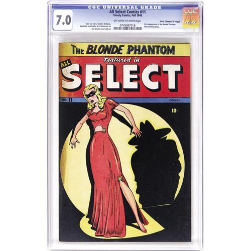 <B>All Select Comics #11 Davis Crippen ("D" Copy) pedigree (Timely, 1946) CGC FN/VF 7.0 Off-white to white pages.</B></I> It's the first appearance of the Blonde Phantom, who had this title renamed for her starting with the very next issue. Miss America also appears, as does a two-issue wonder named the Mysterious Mr. Wu. The cover is by Syd Shores. Overstreet 2006 FN 6.0 value = $810; VF 8.0 value = $1,688. CGC census 6/06: 2 in 7.0, 4 higher. <I>From the Crippen Collection.</B></I> <BR><BR><B>Important notice:</B> Heritage usually auctions material at the rate of 200-250 lots per hour. On some occasions eBay Live bid software or the Internet may not be able to keep up with the pace of the auction. We recommend placing a realistic absentee bid now as insurance to avoid disappointment. Occasionally the auctioneer may eliminate or reject an eBay Live bid, and the auctioneer may also reopen a lot after the close of the eBay live bidding (usually because we missed an audience bid), and may reject your bid even if it shows you as the winning bidder. By bidding via eBay Live, you agree that Heritage may award the lot to another bidder at its sole discretion under the circumstances described above or any other reasonable circumstances. Since eBay bids are not shown to us until we open the lot on the floor, we treat those bids just like floor bids. In most cases the floor responds before the eBay bid is presented to us, due to Internet lag time, so for consistency we have made it a policy that floor bids are always considered first over tie eBay live bids. Also please note that all Heritage lots purchased through eBay Live carry a 22.5% Buyer's Premium. Please make sure you read the Terms and Conditions before you bid. This lot is being auctioned in conjunction with a live floor auction by Heritage Auction Galleries. All final auction and invoice information will be supplied by Heritage Auction Galleries, and all other information should be considered preliminary. Lot:41001 <BR><BR><B>Winning Notification and Billing:</B> After the FINAL session in this auction is complete, Heritage will send e-mail and snail mail invoices. This process normally takes several days. All final auction and invoice information will be supplied by Heritage Auction Galleries, and all other information should be considered preliminary. <BR><BR>This auction will be conducted on a live auction floor and over the Internet through eBay Live. If you choose to place an absentee bid, please take a moment to <font color='#0000ff'><u><a href='http://pages.ebay.com/liveauctions/help/before/laabsentee.html'>learn how eBay Live absentee bidding works</a></u></font><font color='#000000'>