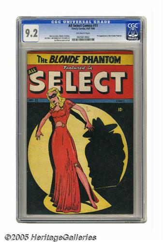 <B>All Select Comics #11 (Timely, 1946) CGC NM- 9.2 Off-white pages.</B></I> The Blonde Phantom makes a sexy, stylish debut on this wonderful Syd Shores cover. Miss America makes an appearance in this issue, which also happens to be the last issue of this title before the title changed to -- what else? -- <B>Blonde Phantom</B></I>. To top it all off, this is the highest-graded copy of this issue certified by CGC as of this writing. Overstreet 2005 NM- 9.2 value = $3,500. CGC census 6/05: 1 in 9.2, none higher.
