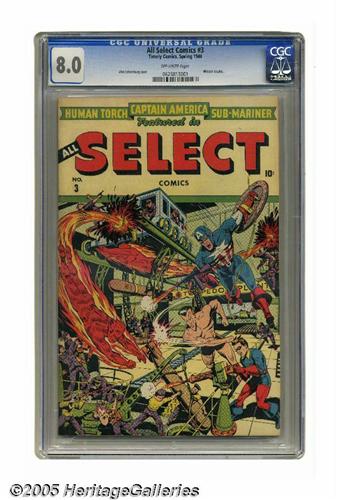 <B>All Select Comics #3 (Timely, 1944) CGC VF 8.0 Off-white pages.</B></I> Timely's frontline of superheroes -- Captain America, Bucky, the Human Torch, and the Sub-Mariner -- wreak havoc on a Nazi torpedo plant in this exquisite Alex Schomburg cover scene; and Marvel's Golden Age speedster, the Whizzer, joined the lineup of heroes starting with this issue. This is also the highest-graded copy of this issue certified by CGC to date. Overstreet 2005 VF 8.0 value = $1,588. CGC census 6/05: 1 in 8.0, none higher.