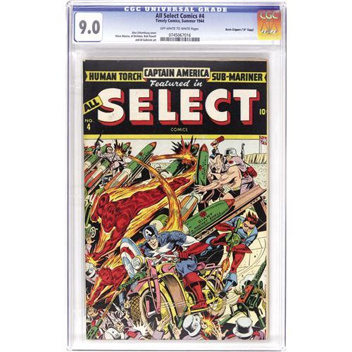 <B>All Select Comics #4 Davis Crippen ("D" Copy) pedigree (Timely, 1944) CGC VF/NM 9.0 Off-white to white pages.</B></I> The sole highest-graded copy of a Timely superhero book is one of the easiest "sells" in all of comics, particularly since we're talking about an Alex Schomburg cover with the Human Torch, Captain America, Sub-Mariner, a host of Nazis, and tons of action! Overstreet 2006 VF/NM 9.0 value = $1,903; NM- 9.2 value = $2,600. CGC census 6/06: 1 in 9.0, none higher. <I>From the Crippen Collection.</B></I> <BR><BR><B>Important notice:</B> Heritage usually auctions material at the rate of 200-250 lots per hour. On some occasions eBay Live bid software or the Internet may not be able to keep up with the pace of the auction. We recommend placing a realistic absentee bid now as insurance to avoid disappointment. Occasionally the auctioneer may eliminate or reject an eBay Live bid, and the auctioneer may also reopen a lot after the close of the eBay live bidding (usually because we missed an audience bid), and may reject your bid even if it shows you as the winning bidder. By bidding via eBay Live, you agree that Heritage may award the lot to another bidder at its sole discretion under the circumstances described above or any other reasonable circumstances. Since eBay bids are not shown to us until we open the lot on the floor, we treat those bids just like floor bids. In most cases the floor responds before the eBay bid is presented to us, due to Internet lag time, so for consistency we have made it a policy that floor bids are always considered first over tie eBay live bids. Also please note that all Heritage lots purchased through eBay Live carry a 22.5% Buyer's Premium. Please make sure you read the Terms and Conditions before you bid. This lot is being auctioned in conjunction with a live floor auction by Heritage Auction Galleries. All final auction and invoice information will be supplied by Heritage Auction Galleries, and all other information should be considered preliminary. Lot:41001 <BR><BR><B>Winning Notification and Billing:</B> After the FINAL session in this auction is complete, Heritage will send e-mail and snail mail invoices. This process normally takes several days. All final auction and invoice information will be supplied by Heritage Auction Galleries, and all other information should be considered preliminary. <BR><BR>This auction will be conducted on a live auction floor and over the Internet through eBay Live. If you choose to place an absentee bid, please take a moment to <font color='#0000ff'><u><a href='http://pages.ebay.com/liveauctions/help/before/laabsentee.html'>learn how eBay Live absentee bidding works</a></u></font><font color='#000000'>