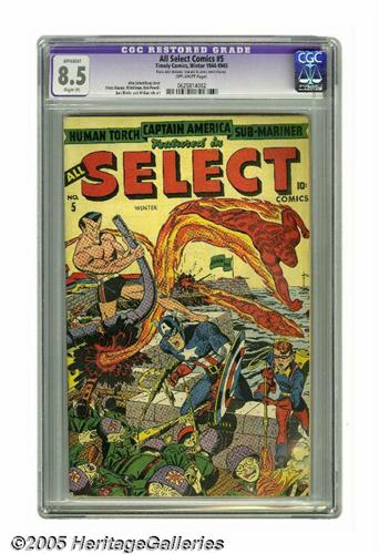 <B>All Select Comics #5 (Timely, 1944) CGC Apparent VF+ 8.5 Slight (P) Off-white pages.</B></I> Maintaining a strict policy of delivering violence equitably between the Nazis (last issue) and the Japanese (in this issue), Timely's superheroes rule the land and sea on this Alex Schomburg cover. Bob Powell, Vince Alascia, Jack Binder, and Al Gabriele provide interior art for this issue, the last featuring the Sub-Mariner. CGC notes, "Restoration includes: tear seal to cover, cover cleaned. Overstreet 2005 GD 2.0 value = $185; VG 4.0 value = $370; FN 6.0 value = $555; VF 8.0 value = $1,156; VF/NM 9.0 value = $1,778.